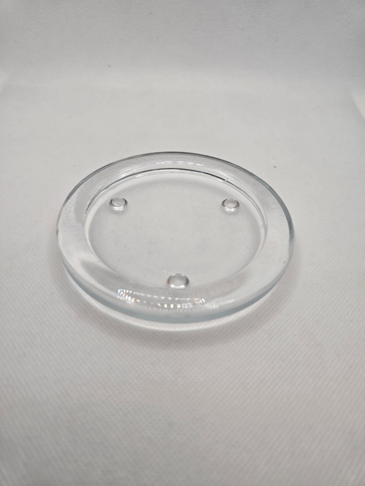 Our Glass Candle Support features a clear, round design with a smooth, polished surface. The support has a slightly raised edge to securely hold your candles in place, ensuring they remain stable and safe. The transparent glass material allows it to blend seamlessly with various decor styles, adding a touch of sophistication to your space. Three small, evenly spaced protrusions on the inner circle help stabilize the candle and prevent it from sliding.
