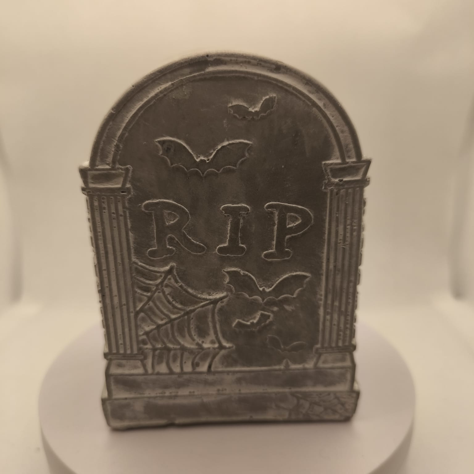 Design and Craftsmanship: The Gravestone Wax Candle features an arched top and two columns on either side, giving it an authentic tombstone appearance. The front of the gravestone prominently displays the letters “RIP” in the center. Adding to its spooky charm, there are three bat figures above and below the “RIP” inscription, and a cobweb detail on the left side.