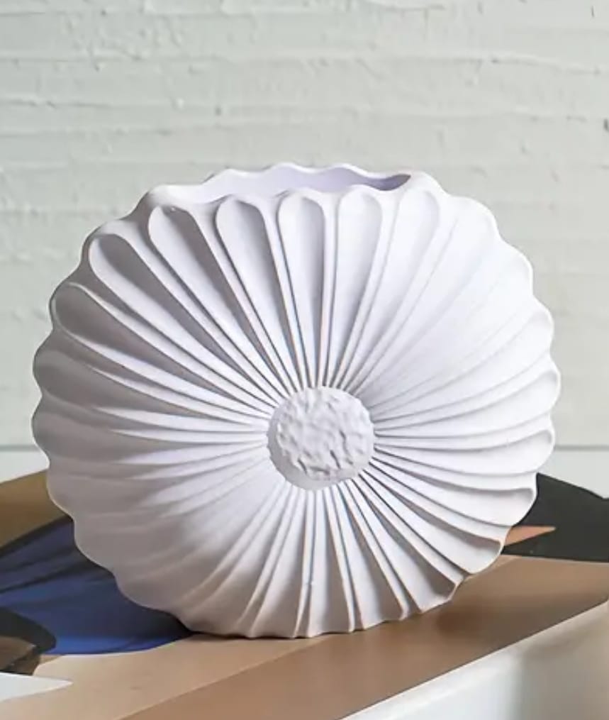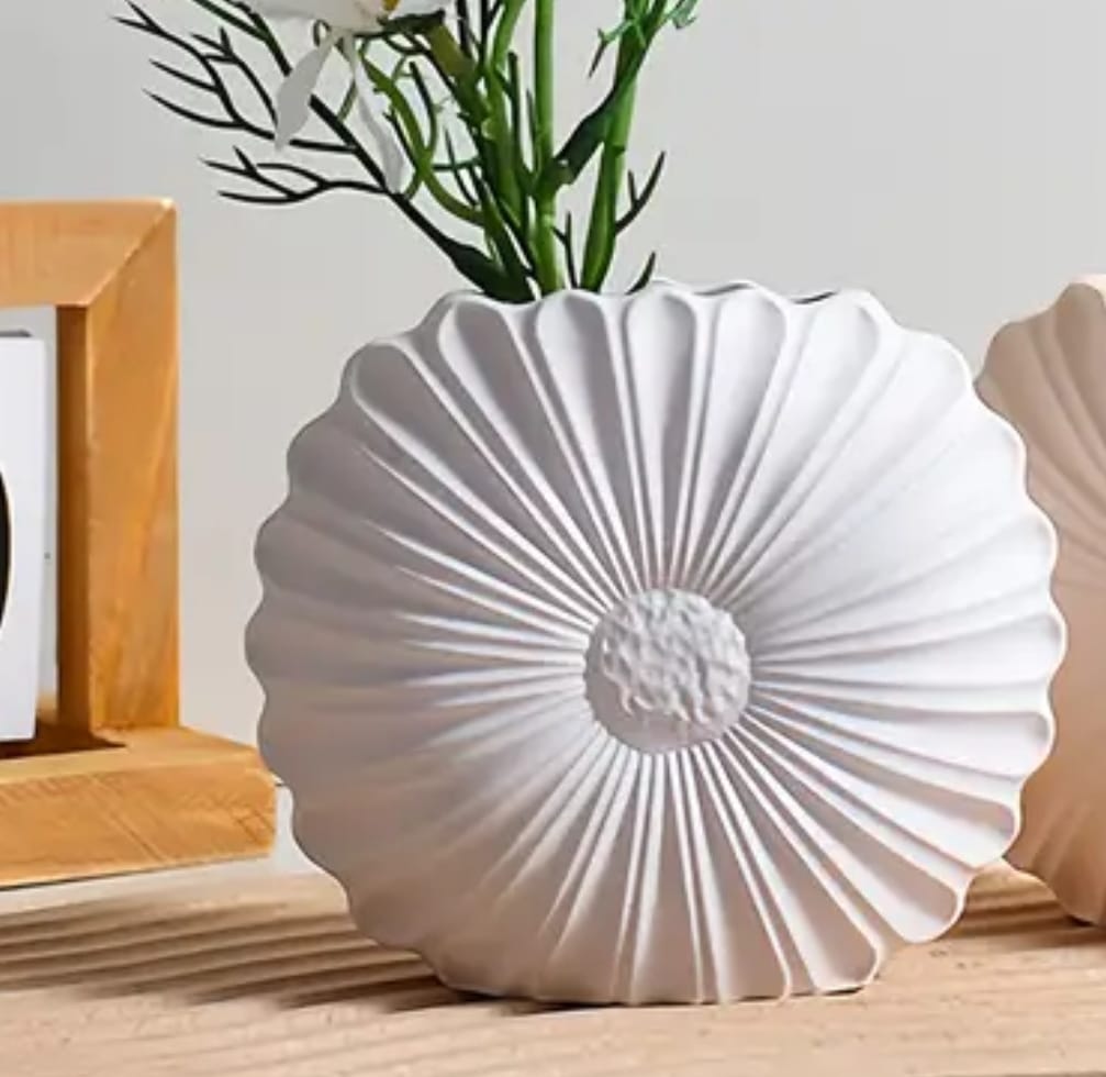 A glossy white ceramic vase with a petal-inspired wave design—perfect for showcasing flowers or adding a modern, elegant touch to any space.