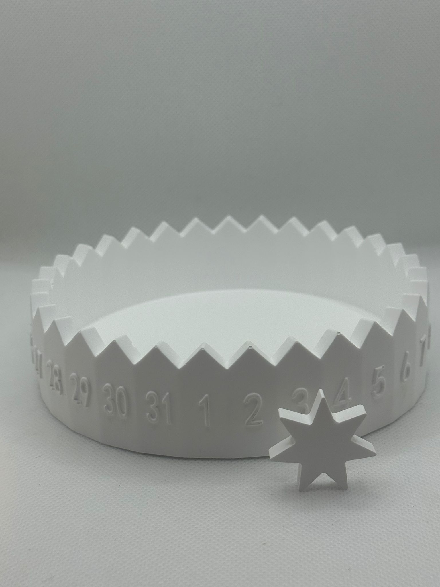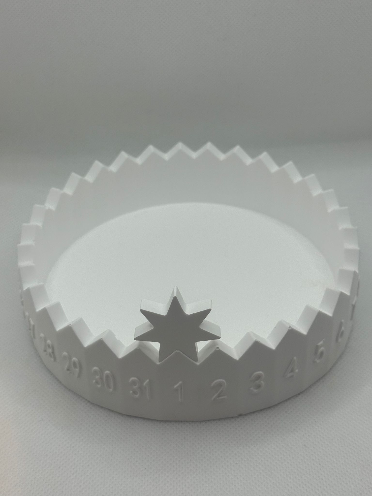 At its center, a movable star-shaped indicator can be rotated to mark the current date, adding both a functional and decorative touch. The clean, monochromatic design blends timeless craftsmanship with modern aesthetics, making it an eye-catching yet practical piece for any workspace or home interior.