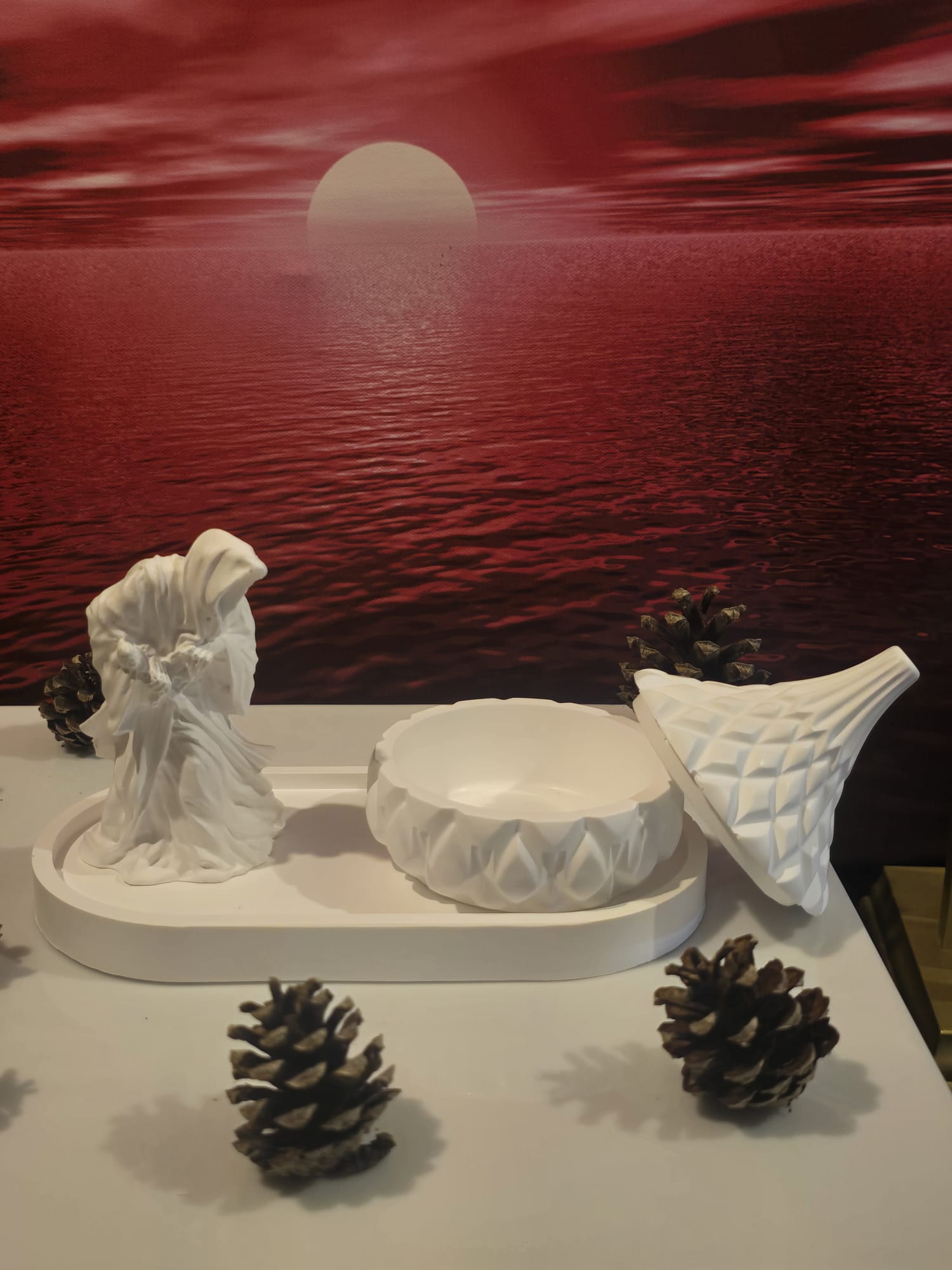 A striking 3-piece ceramic set featuring a faceless hooded figure, sculpted container, and tray — perfect for adding mystery and elegance to your decor.