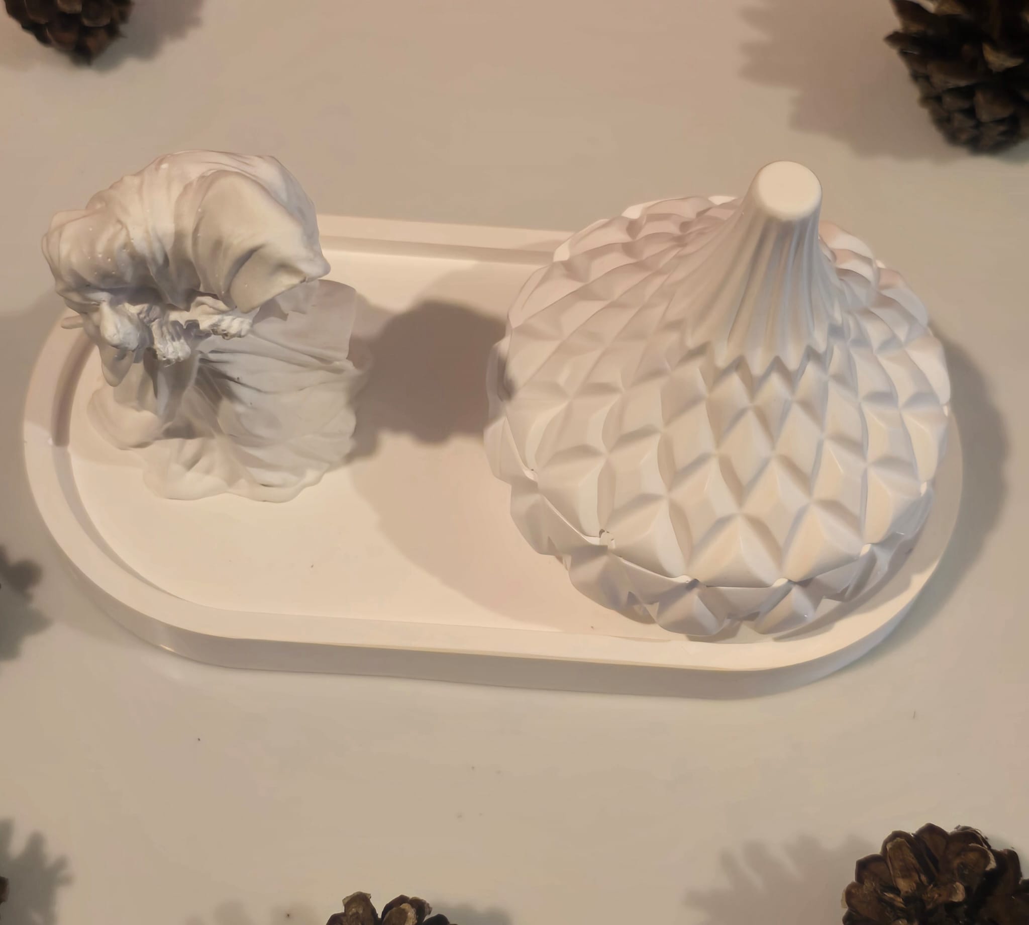 • A textured lidded container — with a sculptural, almost scale-like pattern that adds depth and intrigue.