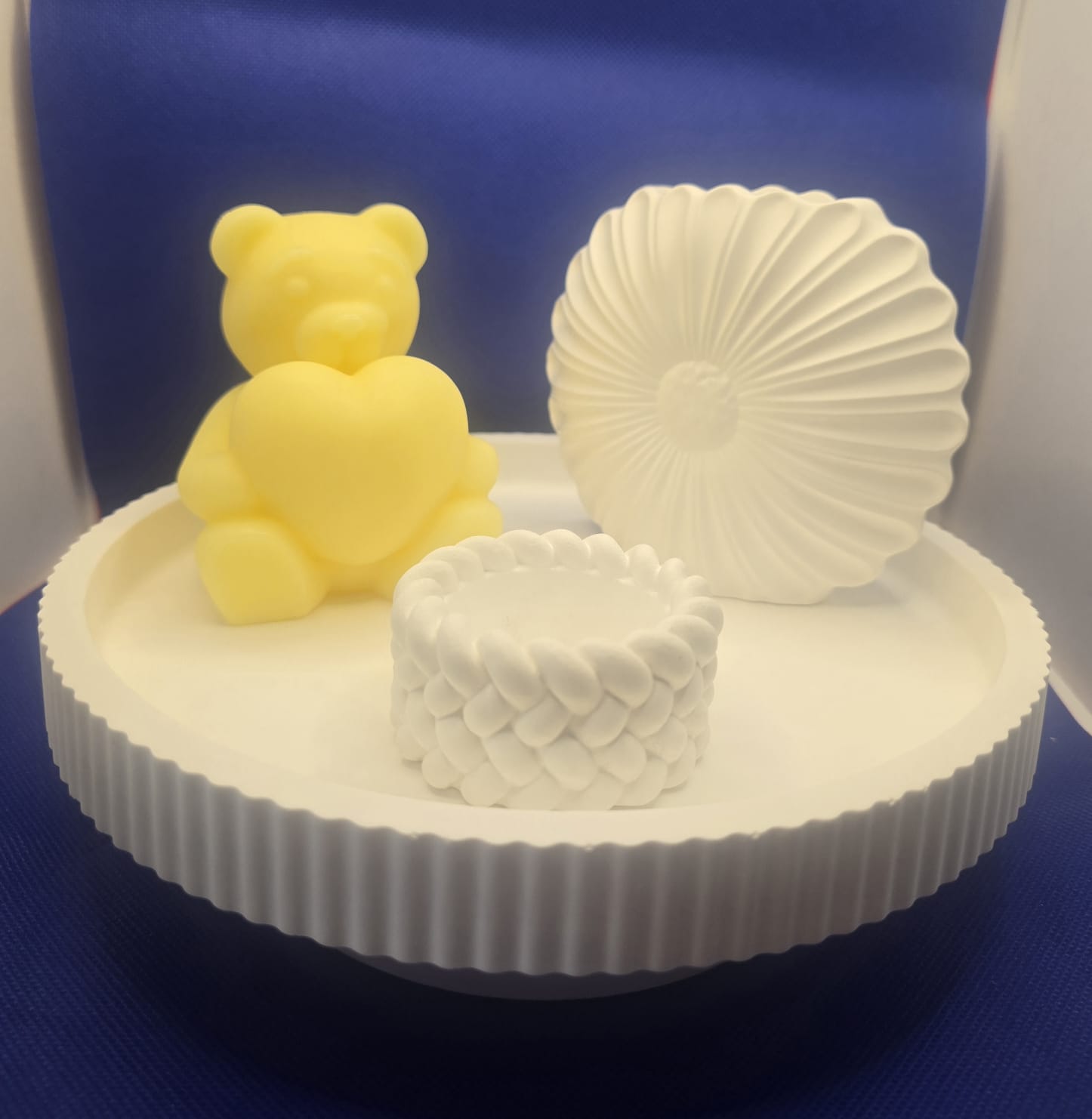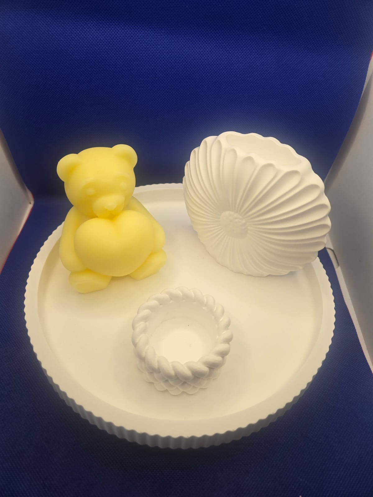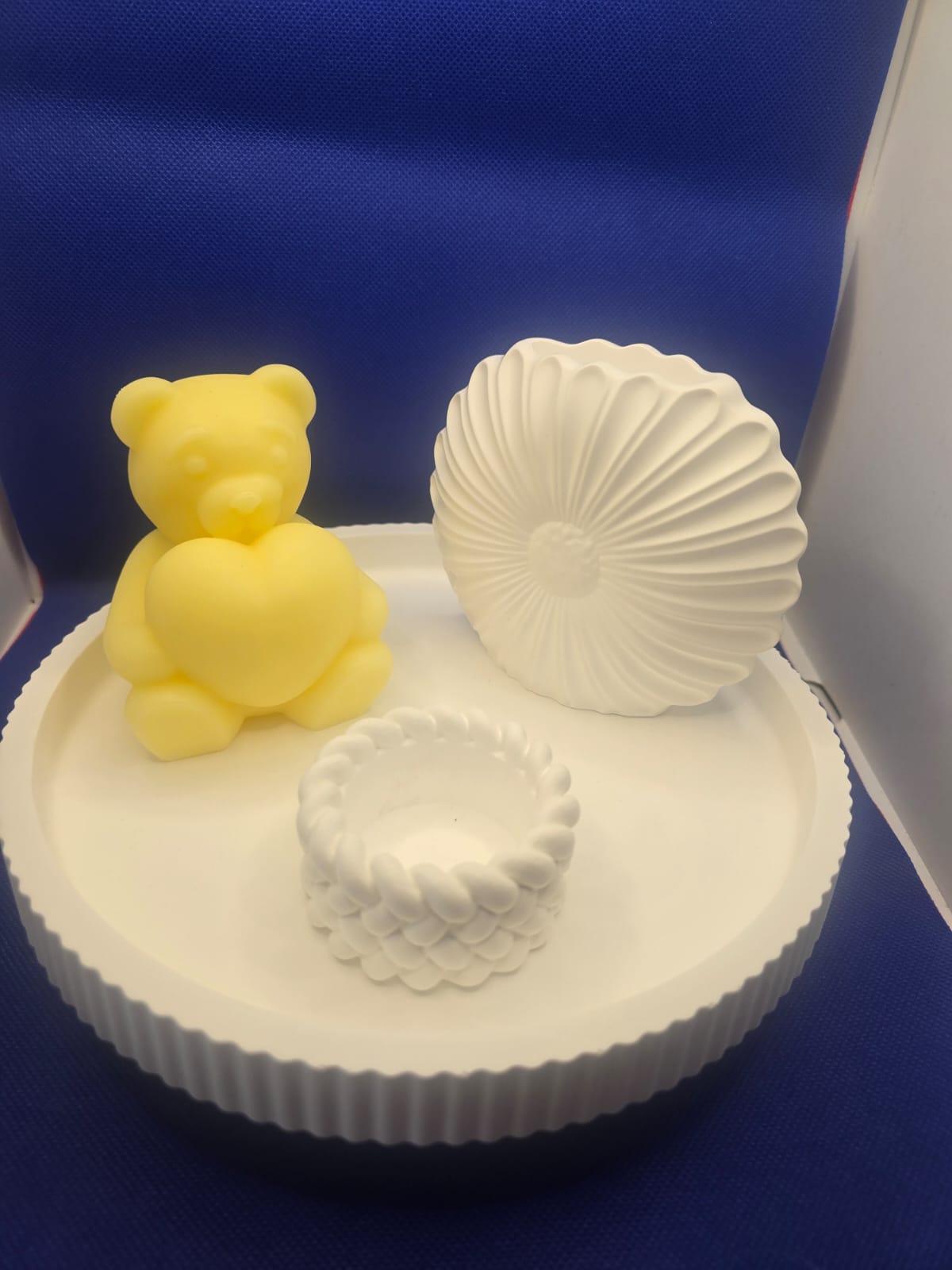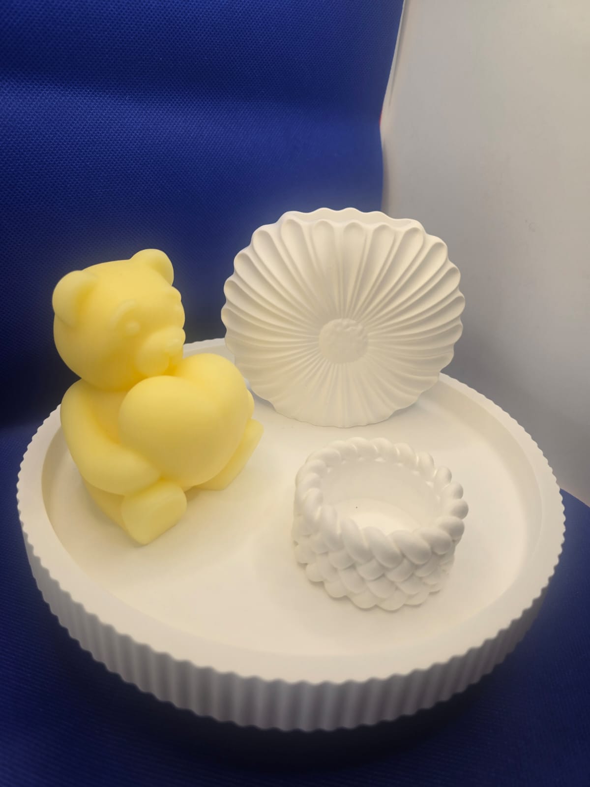 This decorative set brings a refined touch of warmth and romance to any interior. It includes elegant ceramic accessories, paired with a teddy bear-shaped candle holding a delicate heart 🧸🕯️ — a subtle symbol of affection and tenderness.